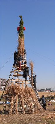 今度の日曜日に地域のお祭り、「どんど焼き」が行われます。毎年小正月の頃の日曜日に水辺の楽校原っぱで、枯れ草をたばねた塔(とう)に火を付けてもやし、今年一年の無病息災(むびょうそくさい:健康で病気などにならないように)を願う行事。今年で19回目です。